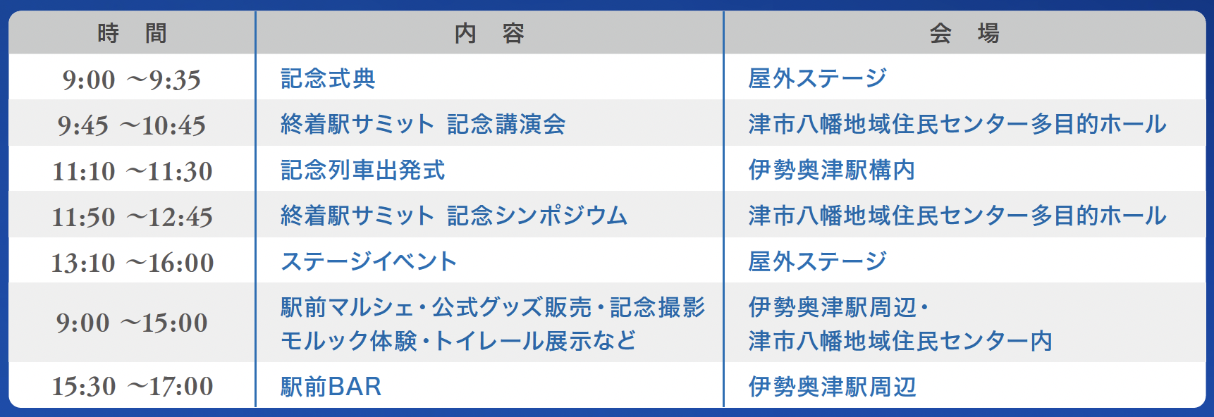内 容:◆ロゴデザイン製作者の表彰◆記念列車の出発式◆車内には津市内の小学生から応募いただいた作品を展示◆津市長・津クイーン川口亜実さんが一日駅長・一日駅員として出発合図