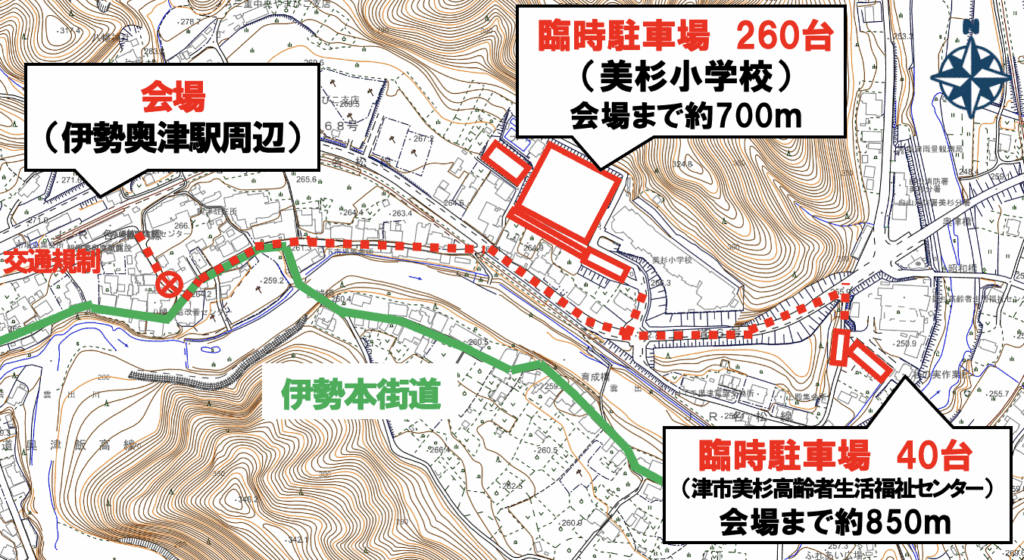 ・臨時駐車場(駐車台数 計300台) 美杉小学校&津市美杉高齢者生活福祉センター ※なお、会場までは伊勢本街道など自然豊かな沿線の景色を楽しみながら徒歩でお越しください。(徒歩約10分程度)