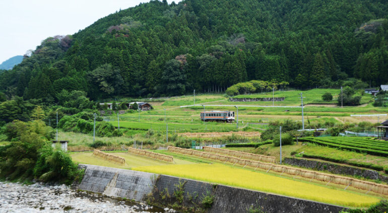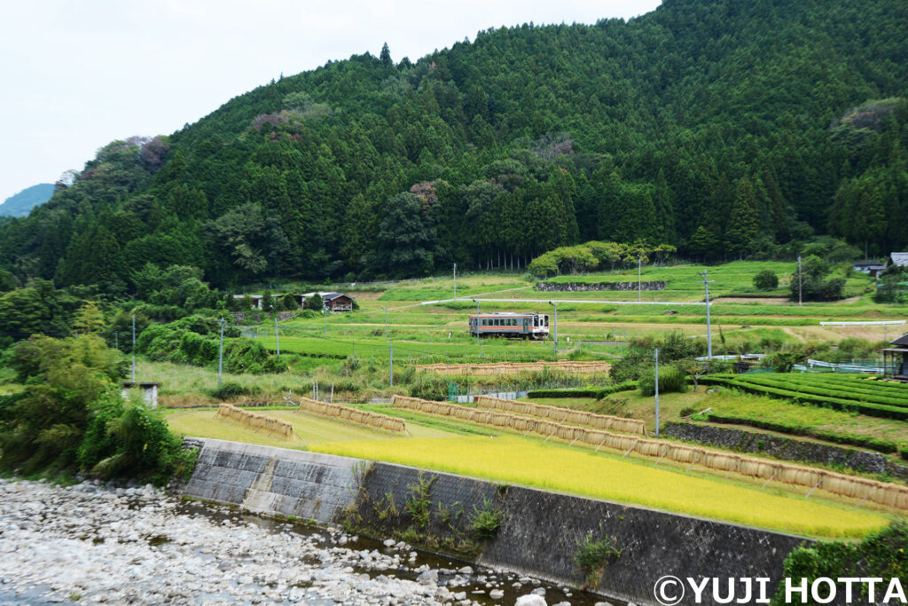 伊勢奥津〜比津◆夏を過ぎると稲刈りが始まり、その刈り取った稲わらを組んで天日干しにする昔ながらの『はざ掛け』が見られます。見れたらうれしい風景です。