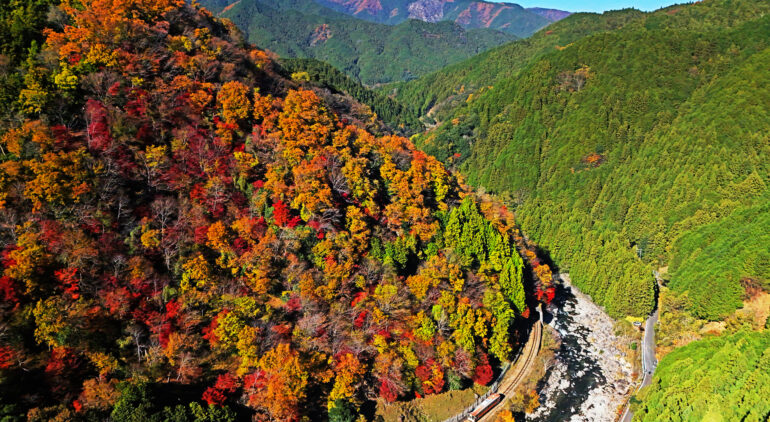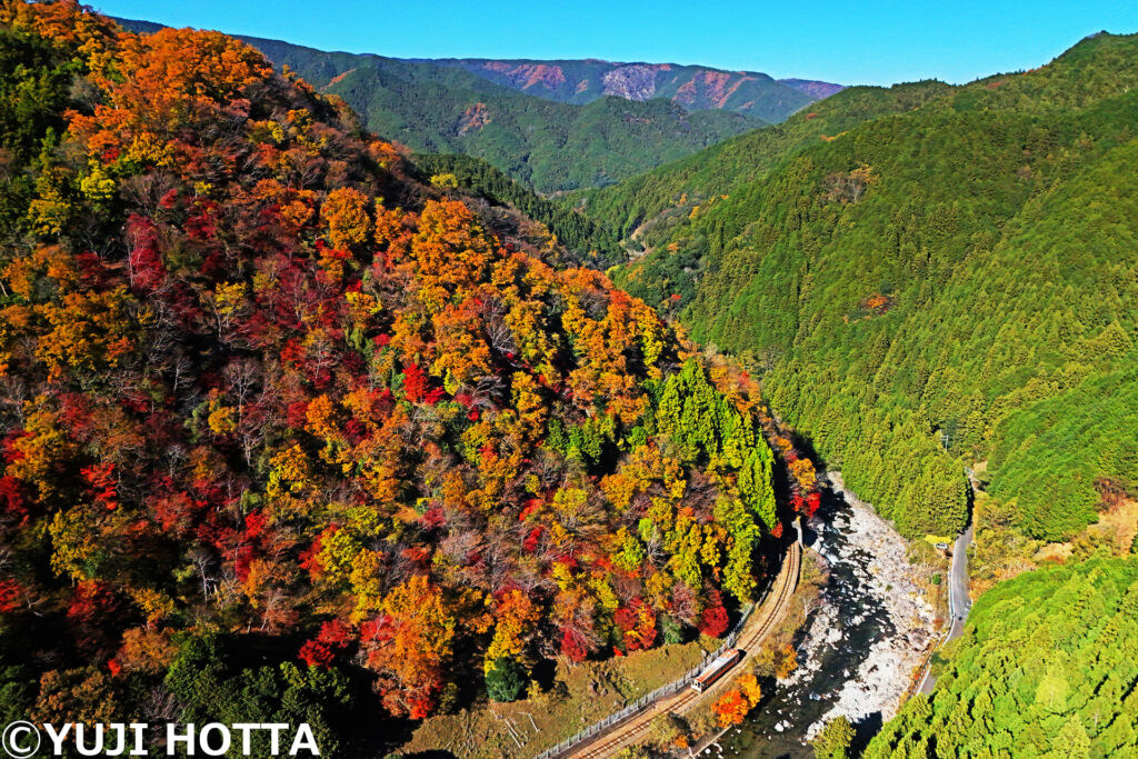 伊勢八知〜比津◆雲出川の流れに沿うように、こんもりとした紅葉の山に沿うように、きょうも列車は前方に注意しながら慎重に進んでいきます。