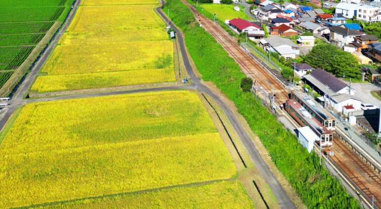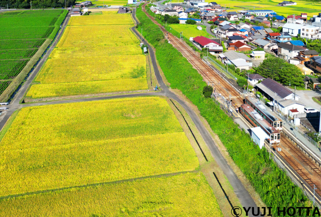 家城◆名松線の上下列車が行き違う唯一の家城駅。その北側には稲穂が垂れる広大な水田があり、収穫が近く