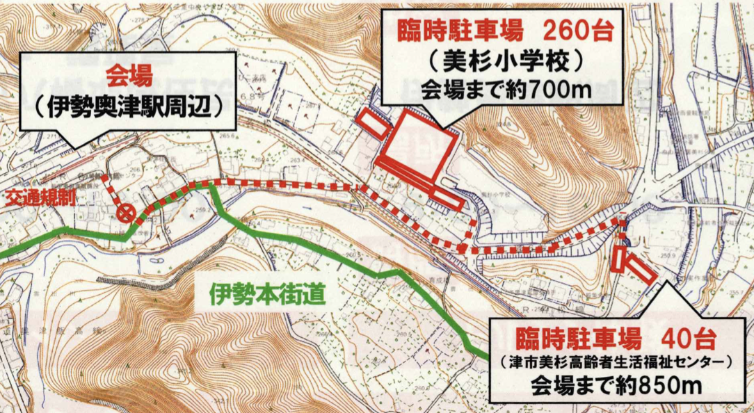 ・臨時駐車場(駐車台数 計300台) 美杉小学校&津市美杉高齢者生活福祉センター ※なお、会場までは伊勢本街道など自然豊かな沿線の景色を楽しみながら徒歩でお越しください。(徒歩約10分程度)